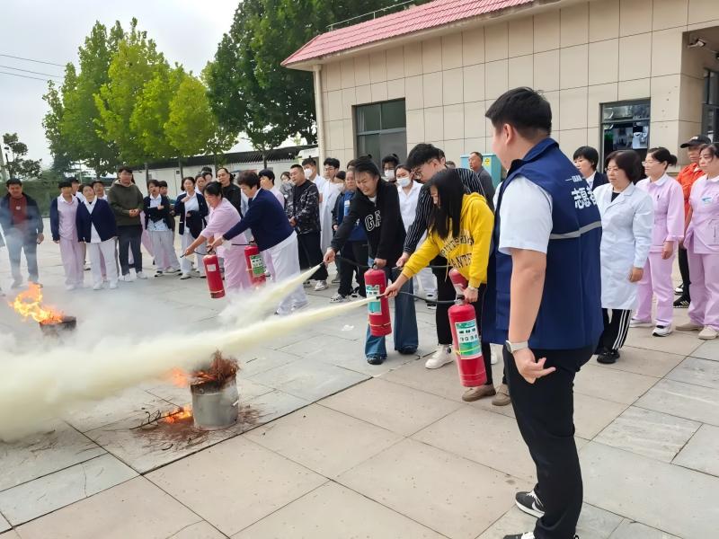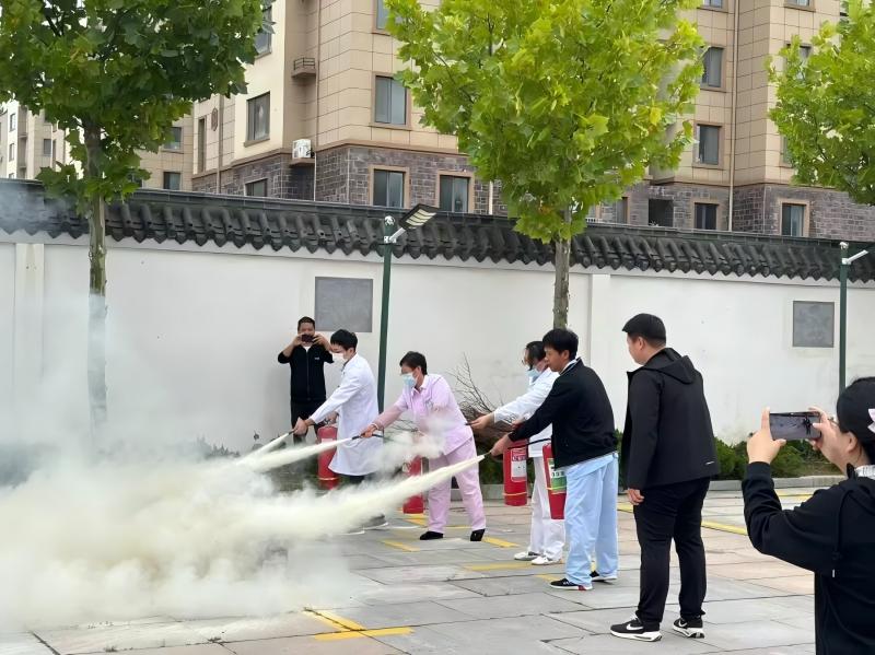 理论讲解结束后,消防专家在中心前院内设置了模拟火情点,摆放了多个干粉灭火器,手把手指导职工操作。“左手握住喷管,右手提灭火器,先拔掉保险销,对准火焰根部,用力按下压把,左右扫射……” 专家一边示范,一边纠正动作细节。从 “不敢碰” 到 “熟练用”,每位职工都轮流上阵,按照“提、拔、握、压” 操作步骤,亲身体验灭火过程。