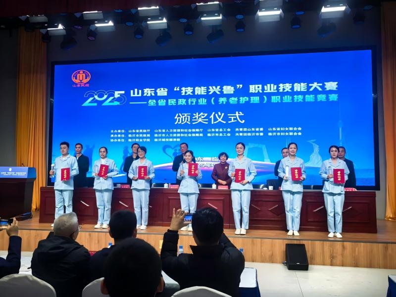近日,中心职工江丽娜(左三)在2025山东省”技能兴鲁“职业技能大赛—全省民政行业(养老护理)职业技能竞赛中荣获三等奖。