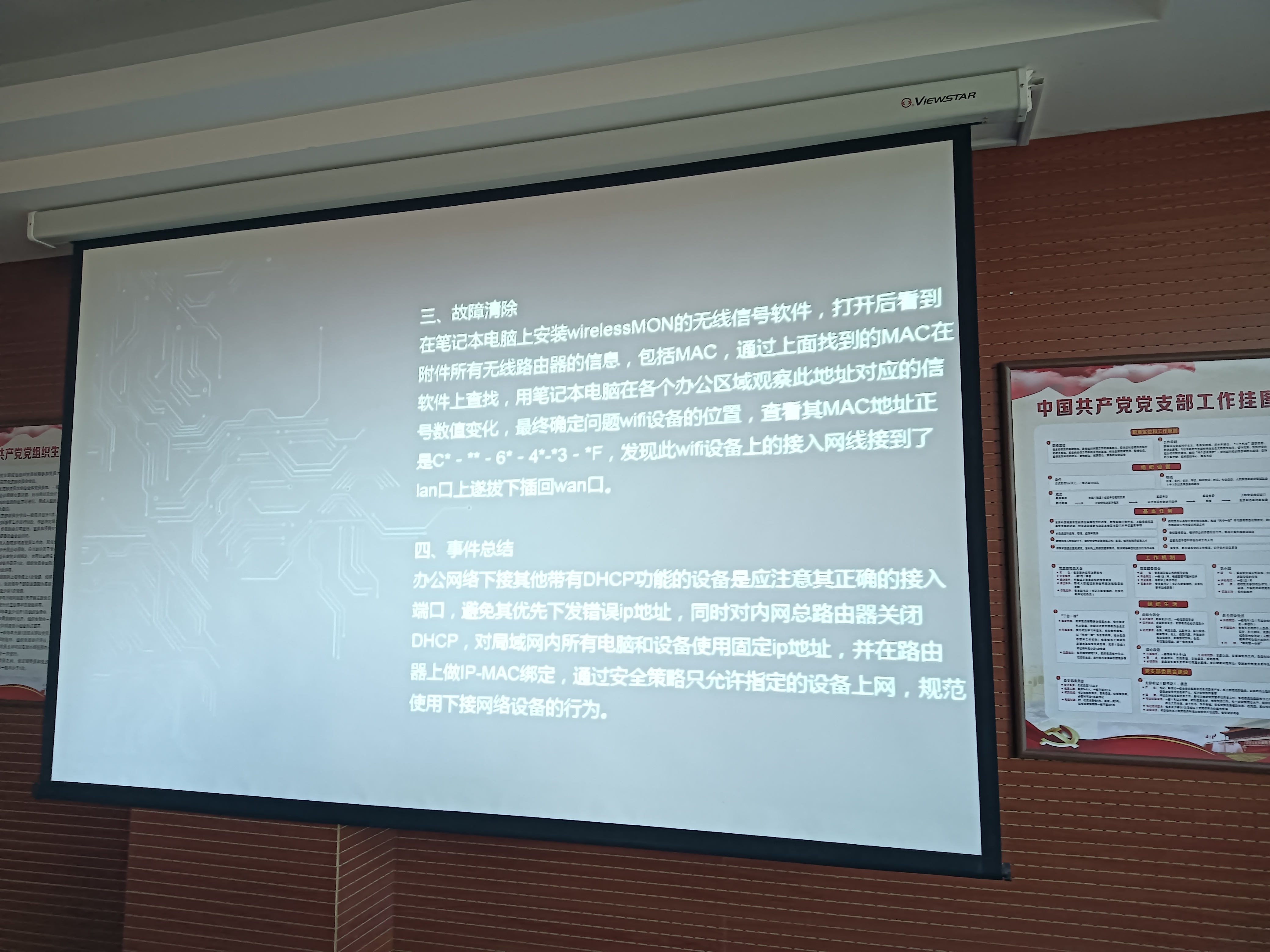 为深入贯彻落实《网络安全法》及《国家网络安全事件应急预案》等法律法规要求,提高网络与信息安全突发事件处置能力,9月28日下午,威海市社会福利中心开展网络安全应急演练,重点进行了木马病毒、系统漏洞及失窃密等事件的应急处置演练,例如现场演示了我中心某些电脑防护软件提示ARP攻击,按照故障排查,故障清除,事件总结流程解决问题,演示了网络安全突发事件的应急处置程序和措施,提升了突发事件应对能力,积累了处置网络安全事件的应急响应经验。